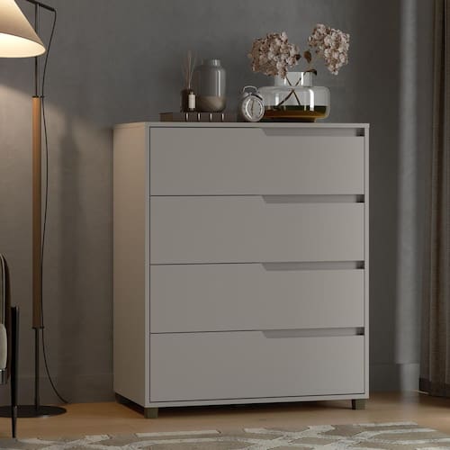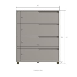 Ideal para você dar um toque de sofisticação e ajudar a manter o ambiente sempre organizado, a Cômoda Monet com 4 Gavetas e puxadores usinados esbanja modernidade podendo ser colocada no quarto ou onde quiser. Ela é fabricada 100% em MDF o que garante a resistência e durabilidade prolongada. Produto Montado: Sim Acabamento da Gaveta: Pintura UV Acabamento dos Pés: Polipropileno Altura dos Pés: 4 cm Altura Máxima dos Pés: 4.0000 Ambiente Principal: Quarto codigo_ean: 7900288025531 Complexidade da Montagem: Média: pode ser montado por mais de uma pessoa e/ou necessite de maior conhecimento para montagem Cor: Cinza Cor do Produto: Cinza Cor Flex: Não Cor Interna: Cinza Escala de Brilho: Fosco Escala de Brilho da Gaveta: Fosco Gaveta com Chave: Não Informações Complementares: 2 kg por gaveta e/ou compartimento Itens Inclusos: 1Produto conforme a descrição, 1kit ferragens + 1manual de montagem Linha ou Coleção: Monet Manual de Especificação Técnica: https://product-hub-prd.madeiramadeira.com.br/970367/documents/94412188-0f9f-4f0e-bc3d-2a39f65624072556753289517319588426752.pdf Manual de Montagem e Instalação: https://product-hub-prd.madeiramadeira.com.br/970367/documents/826ccd52-9f53-459a-99c5-e372654e130e2556724289517319584273156.pdf Marca: Casamia Material da Gaveta: MDF Material do Fundo: HDF Material dos Pés: Plástico Material Principal: MDF Montagem Flex: Não Necessita Montagem: Sim Origem do Produto: Nacional Pés Reguláveis: Não Peso: 38,5 kg Peso Máximo por Gaveta: 2 kg Possui Espelho: Não Possui Nichos: Não Possui Pés: 05 Possui Portas: Não Possui Prateleiras: Não Possui Rodízio: Não Quantidade de Gavetas: 04 Gavetas Recomendações de Uso, Manutenção e Limpeza: Pano limpo e macio, isento de impurezas, seco ou levemente umedecido com água e sabão neutro, bem torcido até que não saia gotas de água. Não devem ser utilizados abrasivos como palha de aço e objetos cortantes. Para remoção de manchas, utilizar pano levemente umedecido com solução de álcool e água em partes iguais. Fonte: Associação Brasileira da Indústria de Painéis de Madeira - ABIPA Sapatas Niveladoras: Não Sistema de Montagem: Parafusos, Cavilhas e Minifix Suporta Até (kg): 18 kg Tipo de Cômoda: Adulto Tipo de Corrediça da Gaveta: Metálica Telescópica Tipo de Puxador da Gaveta: Não Possui