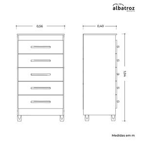 Características do Produto: Marca: Albatroz Modelo: Esmeralda Material do Produto: MDP Material da Porta: MDP Tipo de Pintura: Pintura UV Acabamento da Pintura: Fosco/brilho Material do Puxador: ABS Tipo de Gaveta: Externa Tipo de Corrediça: Metálica Material dos Pés: ABS Possui Gavetas: Sim Q. de Gavetas: 5 Possui Pés: Sim Q. de Pés: 4 Necessita Montagem: Sim Peso Suportado Pelas Gavetas -kg-: 5 Complexidade de Montagem: Alta Complexidade. Recomendasse a Contratação de Montador Profissional. Manutenção e Limpeza: Limpar Com Flanela ou Pano Macio Seco, Não Utilizar Produtos Abrasivos, Desengordurantes, Álcool ou Solvente. Não Expor o Produto Diretamente à Luz Solar e à Umidade.