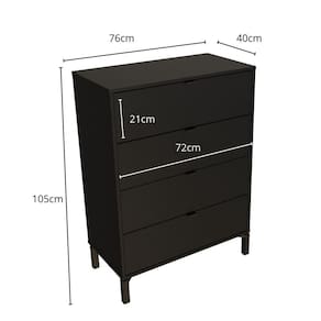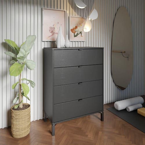 A cômoda Queens possui um visual dinâmico com 4 gavetas altas, adaptando-se para armazenar diversos itens da rotina. Com ótimo espaço de armazenamento e design marcante, ela se destaca em diversos projetos.