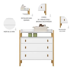 Caracteristicas: Marca: Qmovi Modelo: Fantasia Material: MDP 15/12/MDF Acabamento: Pintura UV Escala de Brilho: Acetinado Tipo de Puxador: Puxador em TPU Quantidade de prateleiras: 01 Quantidade de gavetas: 03 Peso suportado: 35Kg -Distribuidos e sem impacto- Peso suportado prateleiras: 10Kg -Distribuidos e sem impacto- Peso suportado gavetas: 5Kg -Distribuidos e sem impacto- Peso suportado tampo: 10Kg -Distribuidos e sem impacto- Tipo de corredicas das gavetas: Telescopicas de 350mm Material dos Pes: MDF de 25mm