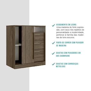 A Cômoda Carraro é uma peça versátil que combina com diferentes espaços e decorações. Possui porta de correr com acabamento em alto brilho, que protege contra riscos e garante alta resistência. Sua última gaveta conta com espaço para guardar peças de maior volume.