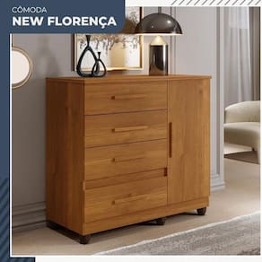 Feito com materiais de alta qualidade e design exclusivo, ele é o complemento perfeito para a decoração da sua casa. A cômoda Florença com seu lindo design trás charme e elegância a qualquer espaço, contém 1 porta e 1 prateleira para acomodar seus acessórios, além de possuir 4 gavetas com corrediça telescópica que proporciona uma maior suavidade em seu uso, ideal para pequenos espaços.