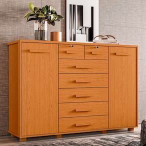 que tal a cômoda fontana? se você busca uma solução prática e elegante para organizar o quarto, a cômoda fontana é a escolha ideal! com estrutura robusta que destaca o tampo alargado, ela tem ótima durabilidade e resistência, além de armazenar tudo o que você precisa no dia a dia - as 7 gavetas com corrediças telescópicas proporcionam abertura suave e completa, além de terem 2 chaves para segurança extra. ah, a peça também possui 2 portas, sendo uma com prateleiras e outra com cabideiro, oferecendo múltiplas opções de armazenamento. cheia de graça, ela ainda tem puxadores em mdf que são puro charme para a decoração do seu cantinho. Marca: Modern