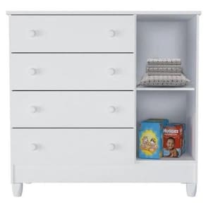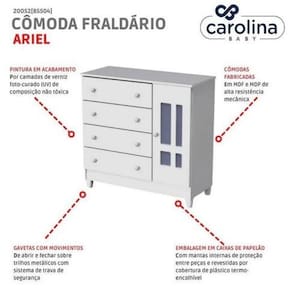 Confira mais um móvel moderno e seguro para quarto infantil: Cômoda Fraldário Ariel Branco Brilho Carolina Móveis! Cômoda fraldário para você trocar o seu baby no seu próprio quartinho, com muito mais segurança e espaço. Uma peça de alta resistência mecânico. A Cômoda Fraldário Ariel traz um design moderno além de ser funcional, irá complementar o quarto do seu filho. Sua estrutura é composta por MDF e MDP de alta resistência, conta com pintura atóxica e acabamento na cor branco de alto brilho. Possui 1 porta, 1 prateleira e 4 gavetas com corrediças telescópicas muito resistentes, que permite abertura total das gavetas, com sistema de trava de segurança. Complemente seu ambiente com a Cômoda Fraldário, e traga mais praticidade para seu dia a dia. Cômoda Fraldário Ariel vem com novas travas 100% anti-tombamento para segurança, suas corrediças telescópicas lhe proporcionara facilidade e praticidade ao abrir as gavetas, seu detalhe em acrílico tem um design sofisticado e alegre para compor o quarto do seu bebê. Não perca essa oportunidade pois seu ambiente ficará ainda mais moderno!