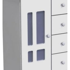 - Gavetas com movimentos de abrir e fechar sobre trilhos metálicos com sistema de trava de segurança