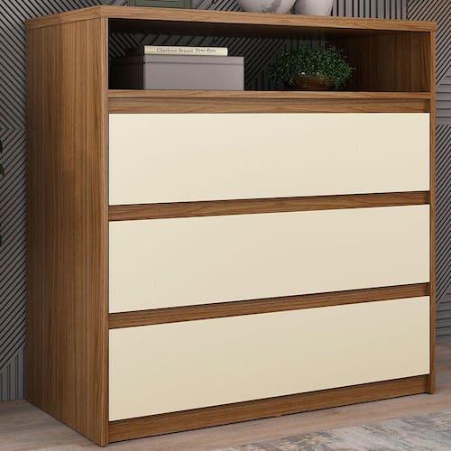 O(a) Cômoda Gales 3 Gavetas 100% Mdf Nogueira/Areia - Mambel é produzido em 100% MDF na escala de brilho Fosco, e possui um grau de dificuldade de montagem: Médio.