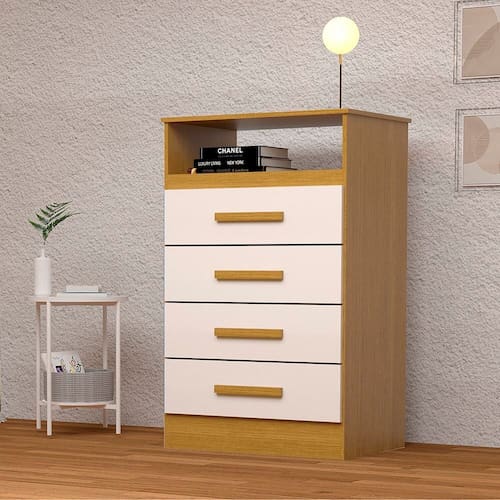 Para você que está buscando um móvel compacto com estilo clássico, a Cômoda Jéssica é perfeita. Com estrutura em 100% MDF, oferece maior resistência e durabilidade. Muito versátil, ela pode ser usada também em outros cômodos além do quarto. Aproveite esse oportunidade agora. Acabamento da Gaveta: Pintura UV Acabamento dos Pés: Pintura Altura dos Pés: 10 cm Ambiente Principal: Quarto Complexidade da Montagem: Média: pode ser montado por mais de uma pessoa e/ou necessite de maior conhecimento para montagem Cor: Cinamomo/Off White Cor do Produto: Cinamomo/Off White Cor Flex: Sim, pode ser montado todo Marrom ou Marrom com Off White. Cor Interna: Cinamomo Escala de Brilho: Semi-Brilho Escala de Brilho da Gaveta: Semi-Brilho Gaveta com Chave: Não Informações Complementares: Estrutura em MDF 12mm e fundo HDF 2,5mm. Peso máximo suportado de 30kg devem ser distribuídos de forma adequada e equilibrada. Itens Inclusos: 1 Cômoda, Kit Ferragens e Manual de Montagem Linha ou Coleção: Jéssica Manual de Montagem e Instalação: https://product-hub-prd.madeiramadeira.com.br/713008/documents/35312e7e-e0e6-4a03-9022-ae78728c9959a15228ComodaJessicanovopux.pdf Material da Gaveta: MDF Material do Fundo: HDF Material do Puxador da Gaveta: Plástico Material dos Pés: MDF Material Principal: MDF Necessita Montagem: Sim Origem do Produto: Nacional Pés Reguláveis: Não Peso: 21,5 kg Peso Máximo por Gaveta: 10 kg Possui Espelho: Não Possui Nichos: 01 Possui Pés: Rodapé Possui Portas: Não Possui Prateleiras: Não Possui Rodízio: Não Quantidade de Gavetas: 04 Gavetas Recomendações de Uso, Manutenção e Limpeza: Para limpar não use nenhum tipo de produto, tais como sabão, esponja de aço, álcool e lustra-móveis. Use somente uma flanela seca. Não molhe nem exponha o móvel à umidade ou a luz solar diretamente ou outra forma de calor. Não encoste o móvel na parede. Não o arreste. Se precisar mudar o móvel de lugar, esvazie por completo o móvel, não o arraste, com ajuda de outras pessoas suspenda o móvel de forma segura e o posicione no lugar desejado. Sapatas Niveladoras: Sim Sistema de Montagem: Parafusos, Minifix e Cavilhas. Suporta Até (kg): 30 kg Tipo de Corrediça da Gaveta: Plástica Tipo de Puxador da Gaveta: Externo