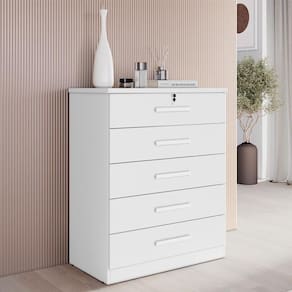 Esta precisando de uma cômoda? Apresentamos a linha Suiça, uma cômoda com 5 gavetas sendo uma delas equipada com chave para garantir mais segurança aos seus pertences. Fabricada em MDP/MDF garantindo qualidade e resistência. Seus puxadores amadeirados agregam charme e sofisticação, tornando-a uma peça versátil para complementar a decoração do seu quarto com estilo e praticidade. Venha aproveitar e garantir já o seu!