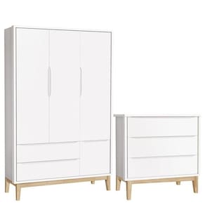 Cômoda Gaveteiro e Guarda Roupa Infantil 3 Portas New Classic Branco com Pés Madeira Natural - Reller