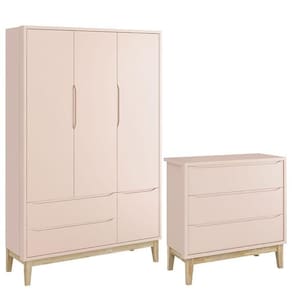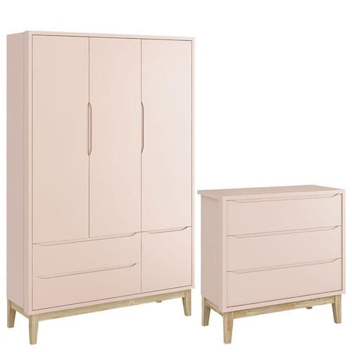 Cômoda Gaveteiro e Guarda Roupa Infantil 3 Portas New Classic Rosa com Pés Madeira Natural - Reller