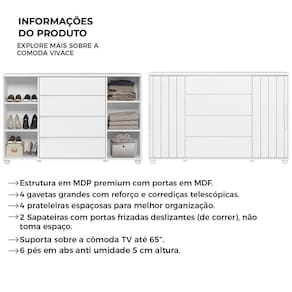 Design inteligente, praticidade e estilo definem a Cômoda Vivace. Versátil e funcional, é ideal para quem busca otimizar o espaço e manter tudo sempre organizado, seja no quarto, closet ou até mesmo na sala, servindo também como base para TVs de até 65?. Adapta-se facilmente a diferentes estilos de decoração, valorizando o ambiente com um visual moderno e elegante.