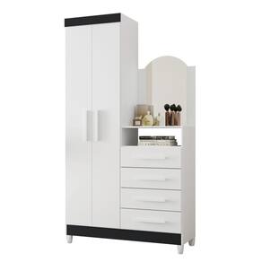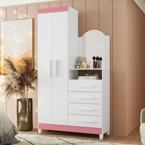 Feito 100% em MDP, além de possuir 2 portas, 4 gavetas, pés de ABS, cabideira de madeira e espelho.