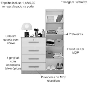 Característica da Cômoda Roupeiro: - Estrutura em MDP; - Acabamento de pintura em UV; - 1 porta de bater com dobradiças metálicas; - 4 Gavetas com corrediças telescópicas; - Primeira gaveta com chave; - Puxadores em MDF revestidos; - Espelho incluso 1,42x0,30 m - parafusado na porta; - 4 prateleiras internas; - Não acompanha itens de decoração ou quaisquer objetos fora o móvel na imagem; - Imagens interna meramente ilustrativa para ver a divisão do produto;