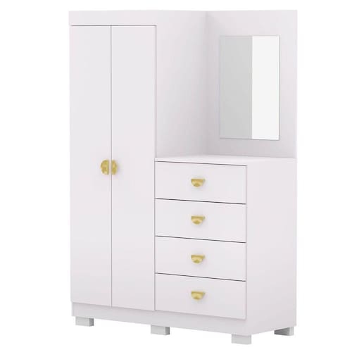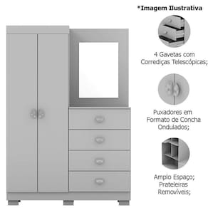 Características da Cômoda Guarda-Roupa Cristine: - Produzido em MDP; - 2 portas com dobradiças metálicas; - 4 gavetas com corrediças telescópicas; - 5 Prateleiras internas removíveis; - Acompanha Espelho; - Pés opicionais na hora da montagem; - Não acompanha objetos de decoração nem itens de vestuário; - Foto interna meramente ilustrativa para ver a divisão do produto; - Montagem por conta do comprador;