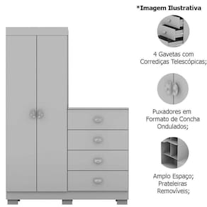 Características da Cômoda Guarda-Roupa Cristine: - Produzido em MDP; - 2 portas com dobradiças metálicas; - 4 gavetas com corrediças telescópicas; - 5 Prateleiras internas removíveis; - Pés opicionais na hora da montagem; - Não acompanha objetos de decoração nem itens de vestuário; - Foto interna meramente ilustrativa para ver a divisão do produto; - Montagem por conta do comprador;