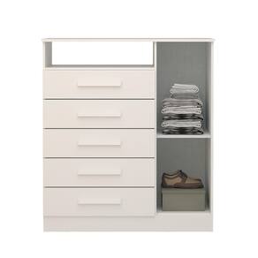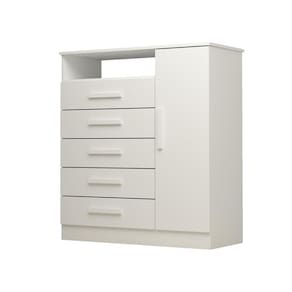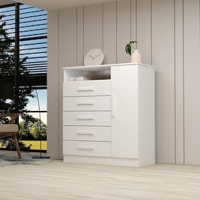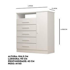 Material: MDF | Acabamento: Pintura UV (Ultravioleta) | Possui Portas: Sim | Quantidade de Portas: 01 | Possui Gavetas: Sim | Quantidade de Gavetas: 05 | Possui Prateleiras: Sim | Tipo de Corrediças: Telescópicas | Material do Puxador: MDF revestido | Necessita de Montagem: Sim | Sistema de montagem: Convencional (Parafusos, minifix e cavilhas) | Prateleiras suportam até: 5 Kg | O produto suporta até: 60 Kg (distribuídos de forma adequada no mesmo) | Altura: 106,5 cm | Largura: 95 cm | Profundidade: 43 cm | Peso: 41 Kg | Garantia: 03 meses | Tipo de Garantia: Garantia do Fabricante | Gavetas suportam até: 5 Kg | Tipo de Móvel: Cômoda | Modelo: Guiana | Marca: Linha Mobília | Quantidade de caixas de embalagem: 2 Cor: Branco