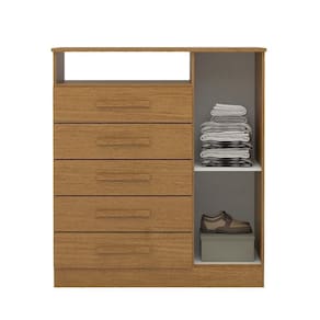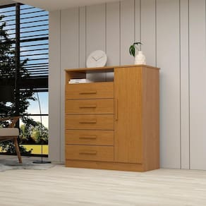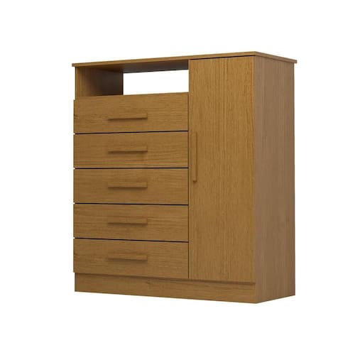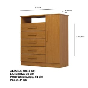 Material: MDF | Acabamento: Pintura UV (Ultravioleta) | Possui Portas: Sim | Quantidade de Portas: 01 | Possui Gavetas: Sim | Quantidade de Gavetas: 05 | Possui Prateleiras: Sim | Tipo de Corrediças: Telescópicas | Material do Puxador: MDF revestido | Necessita de Montagem: Sim | Sistema de montagem: Convencional (Parafusos, minifix e cavilhas) | Prateleiras suportam até: 5 Kg | O produto suporta até: 60 Kg (distribuídos de forma adequada no mesmo) | Altura: 106,5 cm | Largura: 95 cm | Profundidade: 43 cm | Peso: 41 Kg | Garantia: 03 meses | Tipo de Garantia: Garantia do Fabricante | Gavetas suportam até: 5 Kg | Tipo de Móvel: Cômoda | Modelo: Guiana | Marca: Linha Mobília | Quantidade de caixas de embalagem: 2 Cor: Cinamomo