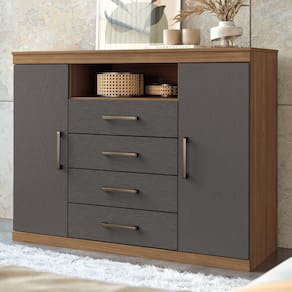 O(a) Cômoda Havana Master 2 Portas 4 Gavetas Jatoba/Grafite - Santos Andirá é produzido em MDP e HDF na escala de brilho Brilhante, e possui um grau de dificuldade de montagem: Médio.