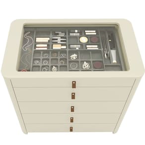 Estrutura: 100% MDF Acabamento: Pintura U.VGaveta: Sim, 05 gavetas, sendo a primeira gaveta com separação porta-joias, com acabamento aveludado, conta com corrediças telescópicas Vidro: Sim, no tampo na parte superior, realçando ainda mais a delicadeza da peça Puxadores: Sim, em poliestireno, que são semelhantes ao couro Diferencial: Cantos Curvos Design: Moderno e sofisticado