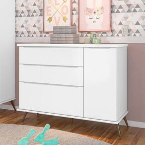 Com a Cômoda Infantil Mel Branco, da Mpozenato, você tem a garantia de estar adquirindo um produto de qualidade, pois é fabricada 100% em MDF de 15mm, ou seja, muito resistente e duradoura. Além disso, é funcional, já que é composta por 3 gavetas e 1 porta que oferecem um amplo espaço para deixar tudo organizado e no lugar. Ah, e os pés palito estilo retrô são um charme a parte e criam um ar vintage ao passo que o design com linhas retas e puxadores modelo cava agregam modernidade.