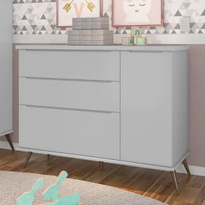 Com a Cômoda Infantil Mel Cinza, da Mpozenato, você tem a de estar adquirindo um produto de qualidade, pois é fabricada 100% em MDF de 15mm, ou seja, muito resistente e duradoura. Além disso, é funcional, já que é composta por 3 gavetas e 1 porta que oferecem um amplo espaço para deixar tudo organizado e no lugar. Ah, e os pés palito estilo retrô são um charme a parte e criam um ar vintage ao passo que o design com linhas retas e puxadores modelo cava agregam modernidade.