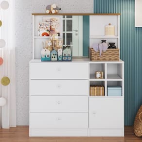 cômoda infantil branca apresenta 4 gavetas, 1 porta, 4 nichos e na parte superior ainda conta com espelho e 2 prateleiras! Uma ajuda e tanto, né?