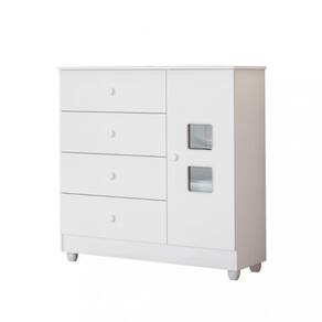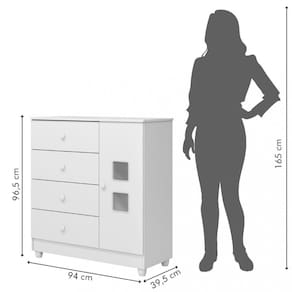 Características: 1 Porta 1 Prateleira interna 4 Gavetas 4 Pés Acabamento acetinado pintura UV Acabamento dos recortes em PVC e acrílico Corrediças telescópicas Estrutura em 100 MDF Pés e puxadores em PVC Possui anti-tombamento