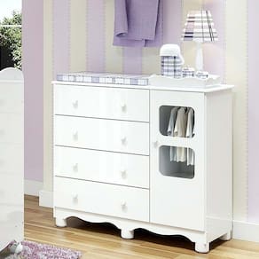 Cômoda Infantil 1 Porta com Janela 4 Gavetas 100% MDF Mimo Branco Brilho. Desenvolvida para oferecer qualidade, beleza, conforto e segurança para toda família na hora de montar o quartinho do(a) bebê. Cômoda produzida com estrutura 100% MDF e acabamento em pintura UV atóxica. Possui 1 porta com janela PETG Cristal/Acrílico, que permite visualizar parte interna do móvel, 4 gavetas que deslizam sob corrediças metálicas telescópicas, 1 prateleira que suporta até 5kg, puxadores e pés em plástico. Acompanham o produto, 2 opções de rodapés, um usinado (torneado) e outro reto, para que você escolha no momento da montagem qual se adequa ao estilo do ambiente. Aproveite para adquirir a sua agora! Ean: 7898593963740