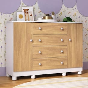 Cômoda Infantil 125cm 2 Portas E 4 Gavetas Allegra Multimóveis Mp4445 Branco/madeirado Branco/madeirado Nada como ter tudo do seu pequeno sempre à mão e com um toque de charme. A Cômoda Infantil 125cm 2 Portas e 4 Gavetas Allegra Multimóveis MP4445 une beleza e funcionalidade, garantindo um espaço organizado desde os primeiros dias. Seu design acolhedor completa o quarto com suavidade e torna cada momento da rotina mais prático e especial. Diferenciais: - 3 anos de garantia contra defeitos de fabricação e material. - Produzida em madeira de reflorestamento (MDP 12/15mm) com acabamento acetinado (cerca de 20% de brilho): sustentabilidade e durabilidade. - 2 portas e 4 gavetas: amplo espaço interno para organizar roupinhas e acessórios. - Corrediças telescópicas: permitem a abertura total e o manuseio silencioso das gavetas. - Cabideiro em alumínio: acomoda as roupas para que não amassem. - Puxadores em ABS redondos e práticos. - Pés em polipropileno e rodapé: estabilidade e visual elegante. - Sistema antitombamento: proporciona segurança para o bebê e tranquilidade aos pais.