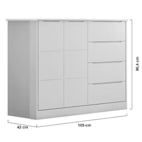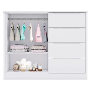 Esta cômoda conta com 2 portas, prateleira, cabideiro e 4 gavetas com corrediças telescópicas que desliza suavemente. É fabricada 100% em MDF com chapa de 12/15mm, revestimento em Pintura Uv atóxica, garantindo segurança e resistência ao móvel.