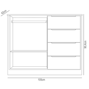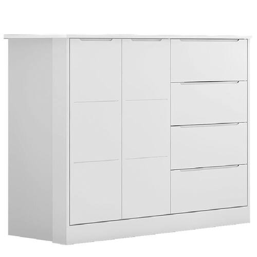 Esta cômoda conta com 2 portas, prateleira, cabideiro e 4 gavetas com corrediças telescópicas que desliza suavemente. É fabricada 100% em MDF com chapa de 12/15mm, revestimento em Pintura Uv atóxica, garantindo e resistência ao móvel.