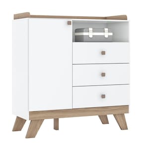 A Cômoda Retrô Theo possui design retrô e elegante, com 3 gavetas e 1 porta e 1 prateleira e 1 nicho, possui espaço perfeito para organização desde roupas até acessórios de seu bebê. As corrediças telescópicas proporcionam um fechamento deslizante suave e seguro, com acabamento em pintura UV e detalhes como puxadores em madeira com pintura garantem a beleza e sofisticação que o quarto do seu bebê merece.
