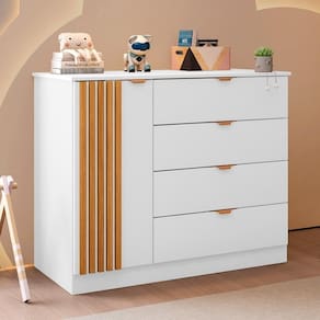Com uma estrutura robusta em MDF e acabamento em pintura UV, este móvel oferece durabilidade e resistência ao uso diário. As 4 gavetas com corrediças telescópicas proporcionam um deslizamento suave, facilitando o acesso aos itens armazenados. A porta com dobradiças metálicas e os puxadores de alumínio na cor cobre conferem um toque de elegância e sofisticação ao produto. A presença de uma prateleira interna permite uma organização eficiente dos acessórios das crianças, tornando a Cômoda Ripada uma escolha versátil que se adapta a diferentes estilos de decoração e necessidades do Quarto infantil. Sua funcionalidade e estética são projetadas para complementar o espaço, criando um ambiente harmonioso e propício para o desenvolvimento dos pequenos.