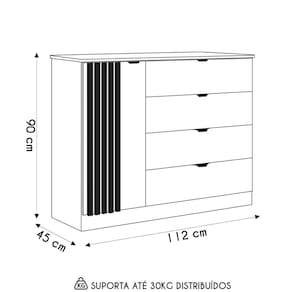 Altura: 90 cm | AssemblyRequired: Sim, sugerimos a contratação do nosso serviço de montagem (para os CEPs em que o serviço está dispon | Color: Branco | ColorFamily: Branco | ColorSimple: Branco | ColorSupplier: Branco | Cor: Branco | Gênero: Unisex | Largura: 112 cm | Manual: Sim | Material: MDF | MaterialFamily: MDF | Model: Ayla | Origem: | OriginCountry: | OriginState: PR | Peso: 41 kg | ProductContents: 1 Cômoda | ProductHeight: 90 | ProductInstructions: Produto para uso em ambiente interno, nao devendo ficar exposto ao sol, calor e umidade excessivos. | ProductLength: 45 | ProductWarranty: 90 dias após o do produto | ProductWeight: 41 | ProductWidth: 112 | Profundidade: 45 cm | Requere montagem: Sim | SizeDescription: 90 x 112 x 45 cm | SupplierSimpleName: Cômoda Infantil 4 Gavetas Com 1 Porta Ripada Ayla Branco - Phoenix