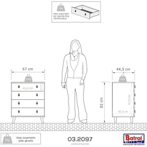 As Cômodas Batrol são ideais para quem tem espaço mais restrito e precisa de um local para guardar e organizar objetos. Na maioria das vezes, as cômodas ainda podem substituir ou complementar móveis maiores, como guarda-roupas ou armários, abrindo espaço físico e visual no ambiente. Acabamento da Gaveta: Pintura UV Altura dos Pés: 12 cm Ambiente Principal: Quarto Infantil Complexidade da Montagem: Média: pode ser montado por mais de uma pessoa e/ou necessite de maior conhecimento para montagem Cor: Branco Cor do Produto: Branco Cor Flex: Não Cor Interna: Branco Escala de Brilho: Brilhante Escala de Brilho da Gaveta: Brilhante Gaveta com Chave: Não Itens Inclusos: 1 Cômoda, Kit Ferragens e Manual de Montagem Linha ou Coleção: Encanto Manual de Montagem e Instalação: https://product-hub-prd.madeiramadeira.com.br/930785/documents/efc53cb5-e46d-4b5c-b271-caf26fc643e12210566464117234807319484.pdf Material da Gaveta: MDP Material do Fundo: HDF Material do Puxador da Gaveta: Plástico Material dos Pés: Madeira Material Principal: MDP Necessita Montagem: Sim Origem do Produto: Nacional Peso: 26,1 kg Peso Máximo por Gaveta: 5 kg Possui Espelho: Não Possui Nichos: Não Possui Pés: 04 Possui Portas: Não Possui Prateleiras: Não Possui Rodízio: Não Quantidade de Gavetas: 04 Gavetas Recomendações de Uso, Manutenção e Limpeza: Pano úmido Sapatas Niveladoras: Não Sistema de Montagem: Parafusos e cavilhas Suporta Até (kg): 30 kg Tipo de Corrediça da Gaveta: Telescópica Tipo de Puxador da Gaveta: Externo