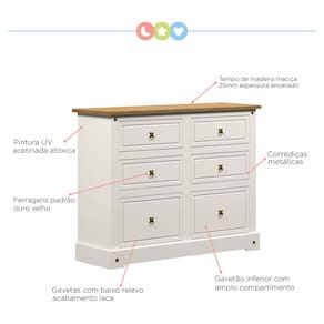 Especializada em móveis, a Serpil prioriza a segurança, o conforto e o bem-estar, por isso desenvolve produtos que seguem as normas de segurança, garantindo a qualidade dos móveis. A Cômoda Smile conta com seis gavetas e corrediças metálicas. Sua estrutura tem corpo em MDF 15mm e tampo em madeira maciça de Pinus 25mm. Sendo assim um móvel durável e de alta qualidade. A Cômoda Smile é perfeita para o seu quarto estilo meio vintage ou retrô, ela une funcionalidade e beleza em um só produto, deixando o ambiente muito mais confortável e bonito. Produto Montado: Sim Acabamento da Gaveta: Pintura UV Acompanha a Almofada: Não Ambiente Principal: Quarto Infantil codigo_ean: 7894047363067 Complexidade da Montagem: Baixa: pode ser montado por uma pessoa sozinha Cor: Bege Cor: Bege Cor do Produto: Bege Cor Interna: Creme Escala de Brilho: Semi-Fosco Escala de Brilho da Gaveta: Semi-Fosco Gaveta com Chave: Não Itens Inclusos: 1 Cômoda e Manual de Montagem. Linha ou Coleção: Smile Manual de Montagem e Instalação: https://product-hub-prd.madeiramadeira.com.br/290002/documents/28ca052e-e884-490f-aa74-a4c3f70c1959c08146011comodasmile6gc944.pdf Material da Gaveta: MDF Material do Fundo: MDF Material do Puxador da Gaveta: Metal Material Principal: MDF Necessita Montagem: Sim Origem do Produto: Nacional Peso: 66,2 kg Peso Máximo por Gaveta: 5 kg Possui Espelho: Não Possui Nichos: Não Possui Pés: Não Possui Portas: Não Possui Prateleiras: Não Possui Rodízio: Não Possui Trocador: Não Quantidade de Gavetas: 06 Gavetas Recomendações de Uso, Manutenção e Limpeza: Limpeza com flanela umedecida em água. Sapatas Niveladoras: Não Sistema de Montagem: Parafusos, cavilhas e minifix. Tipo de Corrediça da Gaveta: Metálica Simples Tipo de Dobradiça/Corrediça da Porta: Metálica Tipo de Puxador da Gaveta: Externo Tipo de Puxador da Porta: Externo Ean: 7894047363067