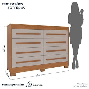 Com design funcional e amplo espaço interno, esta cômoda infantil possui 8 gavetas que facilitam a organização do enxoval e acessórios. Equipada com puxadores em MDF, corrediças telescópicas para abertura suave e pés em PVC que elevam o móvel do chão, oferecendo mais praticidade no dia a dia e proteção contra a umidade. Uma escolha prática e charmosa para o quarto infantil. Produto Montado: Sim Acabamento da Gaveta: Pintura UV Altura dos Pés: 5 cm Altura Máxima dos Pés: 5.0000 Ambiente Principal: Quarto Infantil codigo_ean: 7900288238931 Complexidade da Montagem: Média: pode ser montado por mais de uma pessoa e/ou necessite de maior conhecimento para montagem Cor: Cinamomo / Off White Cor do Produto: Cinamomo / Off White Escala de Brilho: Semi-Fosco Gaveta com Chave: Não Itens Inclusos: 1 Cômoda, Manual de Montagem e Kit Ferragens. Manual de Montagem e Instalação: https://product-hub-prd.madeiramadeira.com.br/233302758/documents/e0d95ac1-641b-4731-a029-d69a80e326dd3102523493817537953624411.pdf Marca: Espresso Móveis Material da Gaveta: MDP Material do Fundo: MDF Material dos Pés: PVC Material Principal: MDP modular: Não Necessita Montagem: Sim Origem do Produto: Nacional Peso: 60,8 kg Peso Máximo por Gaveta: 5 kg Possui Espelho: Não Possui Nichos: Não Possui Pés: 06 Possui Portas: Não Possui Prateleiras: Não Possui Rodízio: Não Recomendações de Uso, Manutenção e Limpeza: Limpeza com pano macio e levemente umedecido. Não utilizar solventes a base e de inflamáveis. Não utilizar produtos abrasivos. Sapatas Niveladoras: Não Sistema de Montagem: Parafusos e cavilhas Suporta Até (kg): 40 kg Tipo de Corrediça da Gaveta: Metálica Telescópica Tipo de Puxador da Gaveta: Externo
