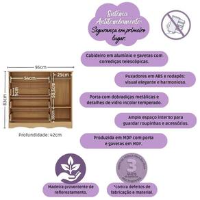 - Detalhes de vidro incolor temperado 3mm na porta: toque charmoso que permite visualizar o interior do móvel.