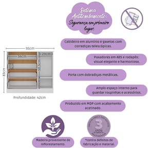 - 1 porta e 4 gavetas: amplo espaço interno para organizar roupinhas e acessórios.