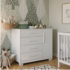 A Cômoda Infantil Charlô Peroba Cor Branco referência 3793.1, com puxadores em ABS, cabideiro metálico, tampo com bordas laqueadas, molduras laterais em MDF revestido, pés reguláveis em ABS inclusos, corrediças telescópicas e sistema antitombamento. A combinação perfeita de estilo, praticidade e segurança, ideal para armazenar roupas, brinquedos e outros itens essenciais. O acabamento em branco traz leveza e luminosidade ao ambiente, enquanto suas linhas retas e suaves garantem um toque contemporâneo. Com 4 gavetas e 1 porta, este móvel oferece amplo espaço para organizar itens do dia a dia, tornando a rotina mais prática. Fabricada em 100% MDF, a cômoda é uma escolha segura para o quarto das crianças. O material é livre de substâncias tóxicas, garantindo um ambiente saudável. Além disso, a resistência do MDF proporciona durabilidade, fazendo com que a cômoda acompanhe o crescimento do seu filho por muitos anos. As gavetas são ideais para armazenar roupas, enquanto o compartimento com porta pode ser utilizado para guardar brinquedos ou outros itens maiores.