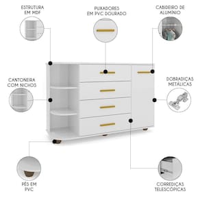 A Cômoda Infantil com Cantoneira e 4 Gavetas 100% MDF New Lorena Branco, da Phoenix Baby é a escolha ideal para quem busca funcionalidade e estilo no Quarto Do Bebê.