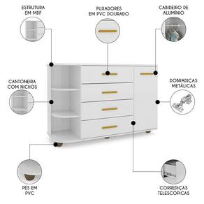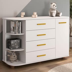 Com um design moderno e diferenciado, a Cômoda Infantil é fabricada com estrutura 100% MDF e pintura atóxica UV alto brilho, o que oferece mais resistência e durabilidade ao móvel. A funcionalidade é elevada com a inclusão de uma cantoneira, uma porta e quatro gavetas espaçosas com corrediças telescópicas, que deslizam suavemente, e puxadores elegantes em PVC dourado, otimizando a organização de roupas e acessórios. É uma ótima escolha para quem busca um móvel completo e de qualidade. E não para por aí! Temos uma linha completa de móveis para Quarto Infantil, incluindo berços, camas juvenis e muito mais.