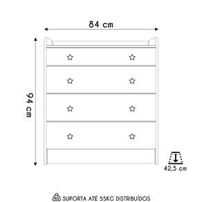 Acompanha pés opcionais em PVC para garantir estabilidade, evitando o contato direto com o chão, enquanto os puxadores duplos de plástico poliestireno, com formato de estrela proporcionam um toque fantástico ao o móvel. O acabamento de alta qualidade, revestido em pintura UV, realça a cor, trazendo um toque sofisticado. Além disso, a cômoda possui sistema antitombamento, oferecendo ainda mais segurança. Essa Cômoda Trocador É perfeita para quem procura aliar estilo na decoração, tornando a rotina com o bebê mais confortável em todas as necessidades do dia a dia.