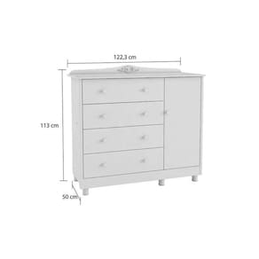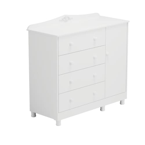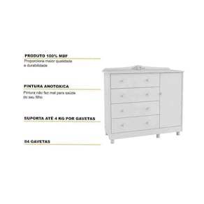 A Cômoda Infantil Elô Peroba Cor Branco referência P2556, com puxadores em ABS, cabideiro metálico, tampo com bordas laqueadas, molduras laterais em MDF revestido, pés reguláveis em ABS inclusos, corrediças telescópicas, linho interno e sistema antitombamento. Acombinação perfeita de estilo, praticidade e segurança, ideal para armazenar roupas, brinquedos e outros itens essenciais.O acabamento em branco traz leveza e luminosidade ao ambiente, enquanto suas linhas retas e suaves garantem um toque contemporâneo. Com 4 gavetas e 1 porta, este móvel oferece amplo espaço para organizar itens do dia a dia, tornando a rotina mais prática.Fabricada em100% MDF, a cômoda é uma escolha segura para o quarto das crianças. O material é livre de substâncias tóxicas, garantindo um ambiente saudável. Além disso, a resistência do MDF proporciona durabilidade, fazendo com que a cômoda acompanhe o crescimento do seu filho por muitos anos.As gavetas são ideais para armazenar roupas, enquanto o compartimento com porta pode ser utilizado para guardar brinquedos ou outros itens maiores.