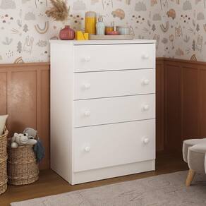 - 4 gavetas com corrediças metálicas: maior leveza no manuseio e amplo espaço interno para armazenar roupas. - Puxadores em ABS delicados e práticos. - Sistema antitombamento e cantos arredondados: garantem segurança para os pequenos. - Tampo suporta até 7kg para apoiar objetos decorativos e embelezar o ambiente. - Rodapé com 4 opções de cores no mesmo produto: escolha o que melhor se encaixar no ambiente durante a montagem.