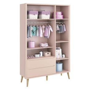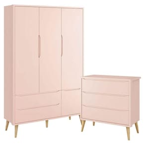 Cômoda Infantil Gaveteiro e Guarda Roupa 3 Portas Theo Rosa com Pés Madeira Natural Reller