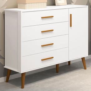 ESPECIFICAÇÕES: • Estrutura 100% MDF • Pintura UV atóxica • Acabamento fosco • 1 Porta • Dobradiças metálicas • 4 Gavetas • Corrediças telescópicas • Sistema anti-tombamento • Puxadores em madeira • Pés estilo retrô em madeira • Amplo espaço interno