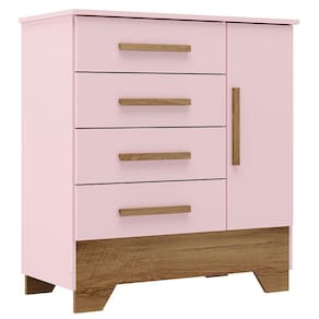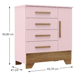 O(a) Cômoda Infantil Kids 1 Porta 4 Gavetas Branco/Rosa - Loja é produzido em MDF e MDP na escala de brilho Fosco, e possui um grau de dificuldade de montagem: Médio.