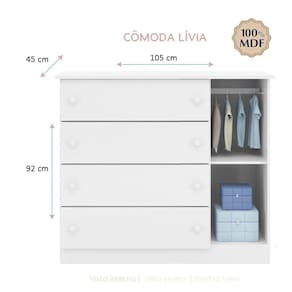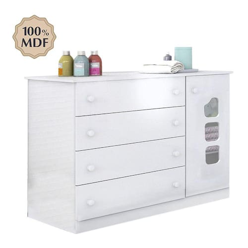CaracterísticasEstrutura em 100% em MDFPintura atóxica com acabamento UV01 Porta articuladaDobradiças metálicas04 Gavetas externasCorrediças metálicasDetalhe em acrílico na porta01 Cabideiro em alumínio para roupas pequenasPuxadores de plásticoPrateleira com amplo espaço internoOBJETOS DECORATIVOS NÃO ACOMPANHAM PRODUTO.Não acompanha colchão. Objetos decorativos não acompanham os PRODUTOSLimpar o produto utilizando apenas pano umedecido com água, nunca utilizar produtos abrasivos ou esponjas de aço. Acompanha manual e todos os acessórios para montagem. Recomendamos que a montagem seja feita por um profissional qualificado. Garantia de 03 meses para eventuais defeitos de fabricaçãoDimensões CômodaAltura 92 cmLargura 105 cmProfundidade 45 cmItens Inclusos01 Cômoda.Peso Total: 50 Kg02 volumesATENÇÃO OBSERVAÇÕES IMPORTANTES.As imagens são meramente ilustrativas, não serão enviados objetos de decoração, eletrônicos e demais itens que não estejam especificados nos itens inclusos. É indispensável que seja feita a conferência do produto no ato da entrega e caso haja alguma divergência, seja feito o contato imediato com a loja e notificação no canhoto. Constatando defeito no ato da entrega o produto não deverá ser montado até tratativa com a loja. Não será efetuada a troca do produto após a montagem ter sido efetuada. A montagem é de total responsabilidade do cliente e defeitos na montagem serão tratadas como assistências. Os processos de pendências serão tratados mediante a fotos para analise e conferência da informação. As cores do produto podem variar de acordo com o seu monitor, a iluminação do ambiente em que você está e até mesmo a sua percepção visual. Não nos responsabilizamos, no ato da entrega, por subir escadas e elevadores. Eventuais despesas são de responsabilidade do cliente. Dúvidas serão tratadas via protocolo.