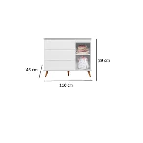 Comoda Retro Lunna 1 porta 3 gavetasA Cômoda Retrô Lunna Peternella conta com amplo espaço interno. Produzida em MDF bio-sustentável, sua pintura é feita diretamente na madeira tratada, proporcionando assim um acabamento melhor ao móvel. Possui 1 porta e 3 gavetas com corrediças telescópicas. É o produto ideal para você que quer aliar qualidade, modernidade e aconchego ao quarto.CARACTERÍSTICASCorrediças Telescópicas;Pés em madeira, estilo retrôPuxadores estilo cavaProduzida em MDF bio-sustentávelDimensõesAltura: 89 cmLargura: 110 cmProfundidade: 45,3 cm